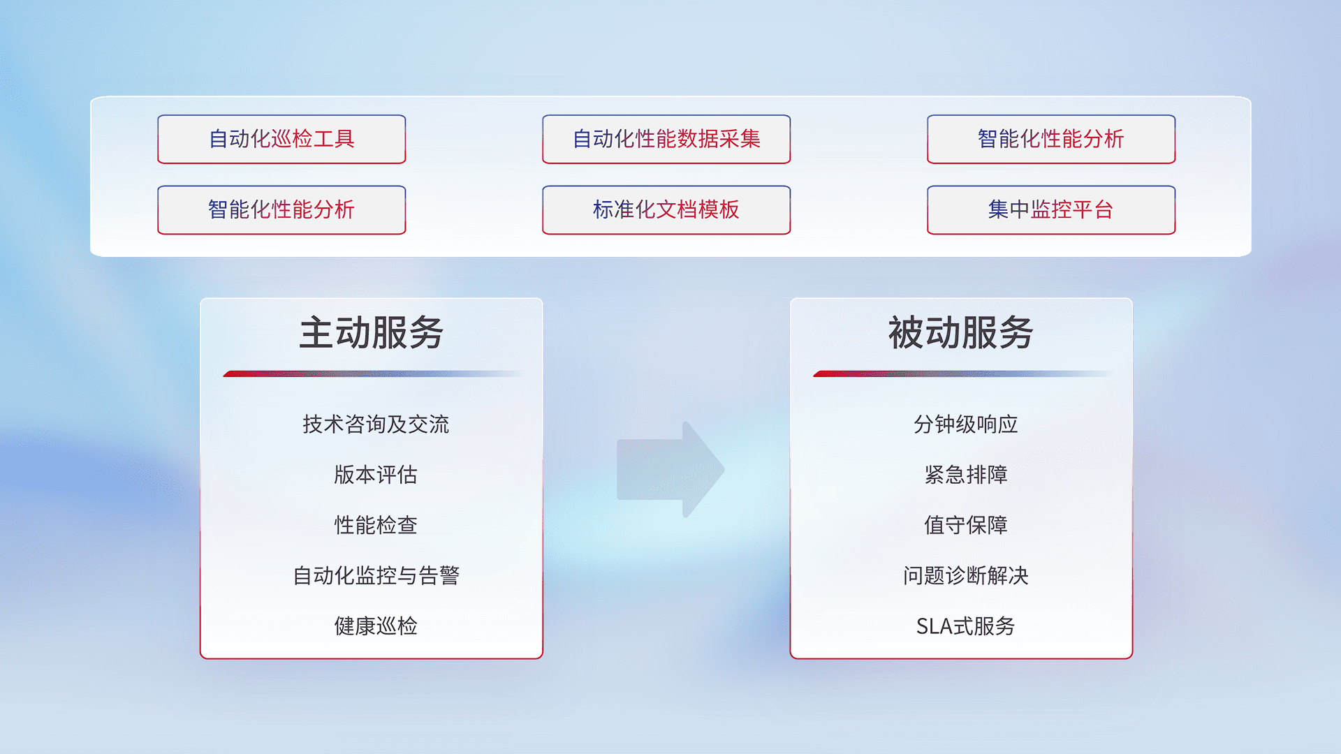 智能化工具和标准化文档,,,保障服务质量,,,,提供主动服务(包含技术咨询、、版本评估、、性能检查、、自动化监控与告警、、、健康巡检)和被动服务包含(分钟级响应、、紧急排障、、、值守保障、、、问题诊断解决、、、SLA服务)。。